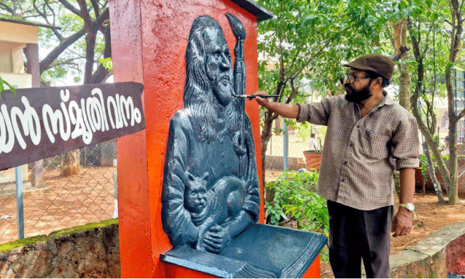 കോട്ടക്കൽ രാജാസ് സ്കൂൾ വളപ്പിലെ സ്മൃതിവനത്തിൽ ഒ.വി. വിജയന്റെ ചുമർചിത്രം മോടികൂട്ടുന്ന ഇന്ത്യനൂർ ബാലകൃഷ്ണൻ