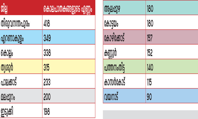 തിരുവനന്തപുരം, എറണാകുളം, കൊല്ലം, തൃശൂർ, പാലക്കാട് ജില്ലകളാണ് പട്ടികയിൽ ആദ്യ അഞ്ചു സ്ഥാനങ്ങളിലുള്ളത്. തിരുവനന്തപുരം -418, എറണാകുളം -349, കൊല്ലം -338, തൃശൂർ -315, പാലക്കാട് -233 കൊലപാതകങ്ങൾ റിപ്പോർട്ട് ചെയ്തു.