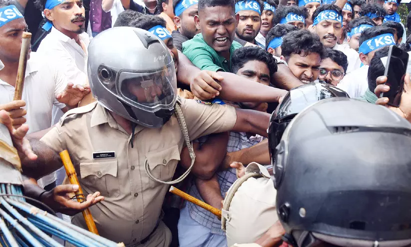 കലാലയങ്ങളിലെ ജാതി വിവേചനത്തിനും റാഗിങ്ങിനുമെതിരെ നടപടിയെടുക്കണമെന്നാവശ്യപ്പെട്ട് കെ.എസ്.യു കലക്ടറേറ്റിലേക്ക് നടത്തിയ മാർച്ചിൽ പ്രവർത്തകരും പൊലീസും തമ്മിലുണ്ടായ ഉന്തും തള്ളും