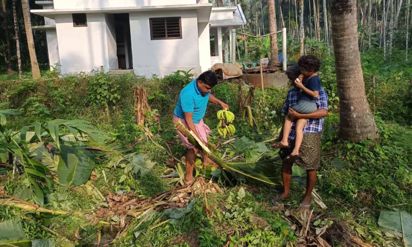 ശനിയാഴ്ച പുലർച്ചെ രണ്ടോടെയാണ് ഒറ്റയാൻ വീട്ടുമുറ്റതെത്തിയത്. പറമ്പിലെ തെങ്ങ്, വാഴ എന്നിവ നശിപ്പിച്ചു. സമീപത്തെ പുളിക്കലകത്ത് ജമീല, മൊളയംപറമ്പിൽ സഫിയ, ഈന്തൻ കുഴിയൻ മുഹമ്മദാലി, കുഞ്ഞാണി എന്നിവരുടെയും വാഴ, തെങ്ങ്, കമുക് എന്നിവ നശിപ്പിച്ച ശേഷമാണ് കൊമ്പൻ കാട് കയറിയത്. രാവിലെ വനം വകുപ്പിനെ വിവരം അറിയിച്ചിട്ടും അവർ വരാൻ കൂട്ടാക്കിയില്ലെന്ന് കുടുംബങ്ങൾ പരാതിപ്പെട്ടു.
