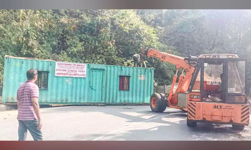 പുതിയ കണ്ടെയ്നർ സ്ഥാപിക്കാൻ വഴിക്കടവ് ആനമറിയിലെ എക്സൈസ് ചെക്ക് പോസ്റ്റിലെ പഴയ കണ്ടെയ്നർ മാറ്റുന്നു