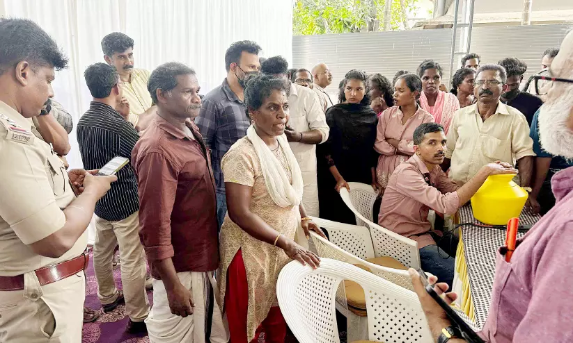 ഭൂരഹിതരായ മുഴുവൻ പട്ടികവർഗ കുടുംബങ്ങൾക്കും ഭൂമി വിതരണം ചെയ്യണമെന്നാവശ്യപ്പെട്ട് നറുക്കെടുപ്പ് നടപടി ഭൂസമരനായിക ബിന്ദു വൈലാശ്ശേരിയുടെ നേതൃത്വത്തിൽ തടയുന്നു