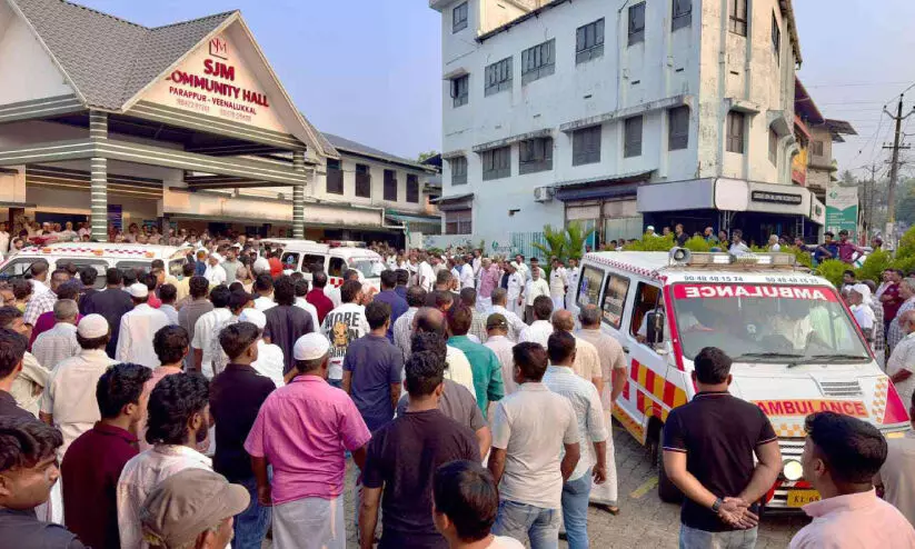 പറപ്പൂർ വീണാലുക്കലിൽ കുളത്തിൽ മുങ്ങി മരിച്ച ഉമ്മയും രണ്ട് മക്കളുമടങ്ങുന്ന മൂന്നു പേരുടെ മൃതദേഹങ്ങൾ വീണാലുക്കൽ ഓഡിറ്റോറിയത്തിൽ എത്തിക്കുന്നു