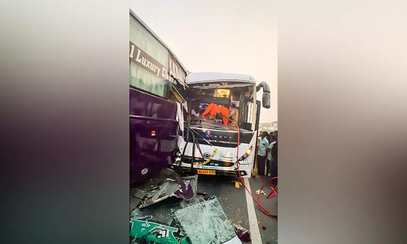പാലക്കാട്: ദേശീയപാത 544ൽ പിരിവുശാലയിൽ വോൾവോ ബസുകളും കാറും കൂട്ടിയിടിച്ച് അപകടം. രണ്ട് ബസുകളും ഒരു കാറും ഒരു ലോറിയും ഉൾപ്പെടെ നാല് വാഹനങ്ങളാണ് അപകടത്തിൽപ്പെട്ടത്. ബംഗളൂരുവിൽനിന്ന് എറണാകുളത്തേക്ക് പോകുകയായിരുന്ന രണ്ട് ബസുകളും കാറുമാണ് ഇടിച്ചത്. ചൊവ്വാഴ്ച രാവിലെ 7.10നാണ് അപകടം. റോഡിൽ നിർത്തിയിട്ടിരുന്ന ലോറിയുടെ പിറകിലേക്ക് ആദ്യം കാറും പിന്നാലെ വന്ന ബസുകളും ഒന്നിന് പിറകെ ഒന്നായി ഇടിക്കുകയായിരുന്നു.