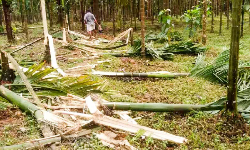 കരിമ്പ മണലി മൂശ്ശാരിപ്പറമ്പിൽ സോജന്റെ ക്യഷിയിടത്തിലെ കമുകുകൾ കാട്ടാന നശിപ്പിച്ച നിലയിൽ