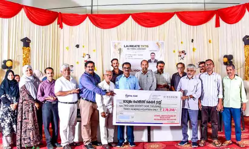 മാധ്യമം ഹെൽത് കെയറിന് വേണ്ടി പേഴുങ്കര മോഡൽ ഹൈസ്കൂൾ വിദ്യാർഥികൾ ശേഖരിച്ച 2,79,314 രൂപയുടെ ചെക്ക് മാധ്യമം ജില്ല ഫീൽഡ് കോഓഡിനേറ്റർ അബ്ദുസ്സലാം മേപ്പറമ്പിന്
