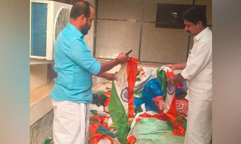 കലക്ടർ, വില്ലേജ് ഓഫിസർ എന്നിവർക്കും പരാതി നൽകി. പ്രധാനമന്ത്രിയുടെ ആഹ്വാനം അനുസരിച്ച് എല്ലാ വീട്ടിലും ഉയർത്താൻ സംസ്ഥാന സർക്കാർ മുൻ കൈയെടുത്ത് കുടുംബശ്രീ മുഖാന്തരം വിതരണം ചെയ്യാൻ എത്തിച്ച പതാകകളാണിത്. സംഭവത്തിൽ അന്വേഷണം നടത്തി കുറ്റക്കാർ ആരായാലും നടപടി സ്വീകരിക്കണമെന്ന് യു.ഡി.എഫ് കൺവീനർ അഡ്വ. അടൂർ പ്രകാശും ഡി.സി.സി പ്രസിഡന്റ് പ്രഫ. സതീഷ് കൊച്ചുപറമ്പിലും ആവശ്യപ്പെട്ടു.