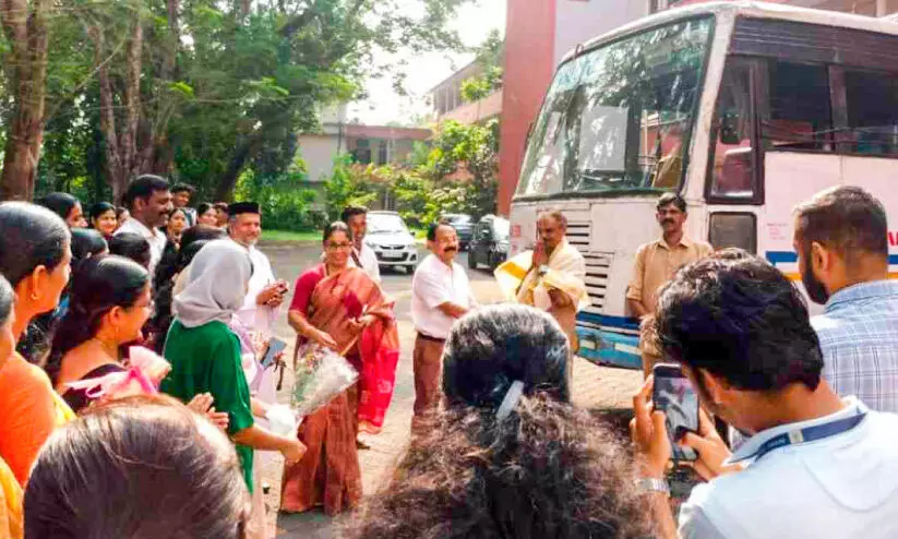 വെച്ചൂച്ചിറ -റാന്നി സെന്റ് തോമസ് കോളജ് റൂട്ടിൽ സർവിസ് നടത്തുന്ന കെ.എസ്.ആർ.ടി.സി ബസിലെ ഡ്രൈവറാണ് രാജേഷ് ബാബു. വെള്ളിയാഴ്ച രാവിലെ കോളജിലേക്ക് പതിവ് സർവിസ് നടത്തിയപ്പോഴാണ് അപ്രതീക്ഷിത ആദരം ഒരുക്കിയത്. കോളജ് പ്രിൻസിപ്പൽ ഡോ. സ്നേഹ എൽസി ജേക്കബ് പൂച്ചെണ്ട് നൽകി സ്വീകരിക്കുകയും മാനേജർ പ്രഫ. റോയി മേലേൽ പൊന്നാട അണിയിക്കുകയും ചെയ്തു.