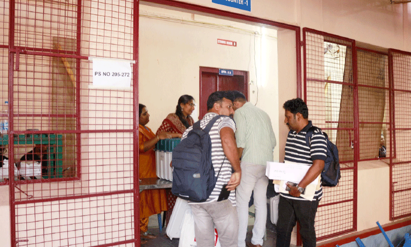 പോളിങ് സാമഗ്രികളുടെ വിതരണ കേന്ദ്രമായ മൈലപ്ര മൗണ്ട് ബഥനി ഇ.എച്ച്.എസ്.എസിലെ ദൃശ്യം