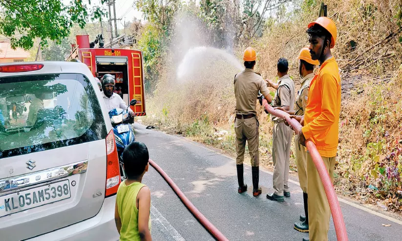 തരിശു പുരയിടത്തിലെ തീ ട്രാൻസ്ഫോർമറിലേക്ക് പടരാതെ അഗ്നിരക്ഷാസേനാ അണക്കുന്നു
