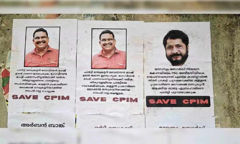 തിരുവല്ല: ആരോപണ വിധേയരായവർക്ക് പാർട്ടി ചുമതല നൽകിയെന്ന് ആരോപിച്ച് സി.പി.എം ജില്ല സെക്രട്ടറി രാജു എബ്രഹാമിനെതിരെ തിരുവല്ലയിൽ പോസ്റ്റർ. സേവ് സി.പി.എം എന്ന പേരിലാണ് പോസ്റ്റർ ഇറങ്ങിയത്. സി.പി.എം തിരുവല്ല ഏരിയ കമ്മിറ്റി ഓഫിസിന് സമീപത്തായാണ് പോസ്റ്ററുകൾ പതിച്ചത്.