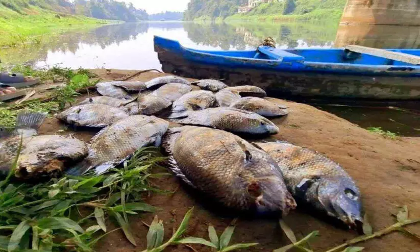 ചാലക്കുടിപ്പുഴയിൽ ചത്തുപൊങ്ങിയ മത്സ്യങ്ങളെ കരയിൽ കൂട്ടിയിട്ട നിലയിൽ