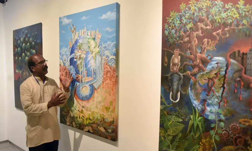 തൃശൂർ ലളിതകല അക്കാദമിയിൽ സംഘടിപ്പിച്ച ചിത്ര പ്രദർശനത്തിൽ രാധാകൃഷ്ണൻ കിഴുത്താണി തന്റെ ചിത്രങ്ങൾക്കരികെ