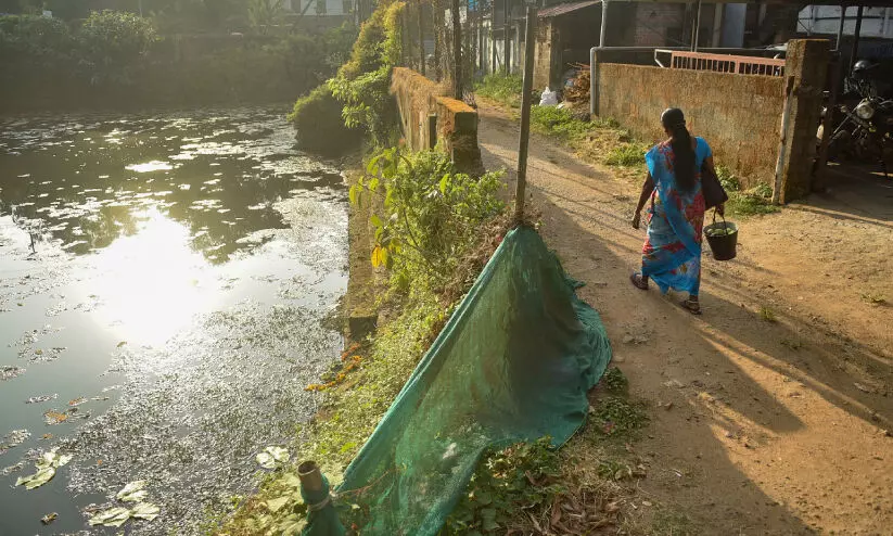 സംരക്ഷണഭിത്തി തകർന്ന് അപകടാവസ്ഥയിലായ കണ്ണംകുളങ്ങര ആലുംകുളം