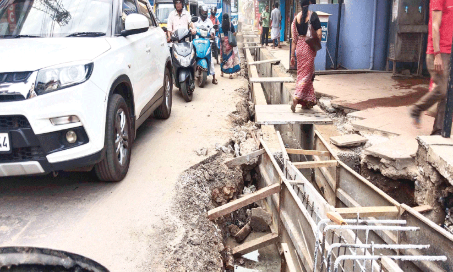 സ്കൂട്ടർ അപകടത്തിൽപെട്ട പാവറട്ടി സെന്ററിലെ ഓട നിർമാണ സ്ഥലം
