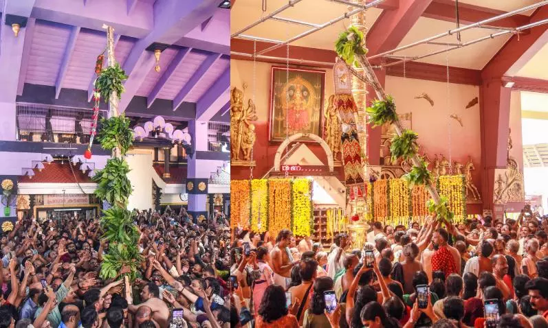 പ്രധാന ക്ഷേത്രങ്ങളിൽ തിരുവമ്പാടിയിലാണ് ആദ്യം കൊടിയേറിയത്. പാരമ്പര്യ അവകാശികളായ താഴത്തുപുരയ്ക്കൽ സുന്ദരൻ, സുഷിത്ത് എന്നിവരുടെ നേതൃത്വത്തിലാണ് കൊടിമരം ഒരുക്കിയത്.