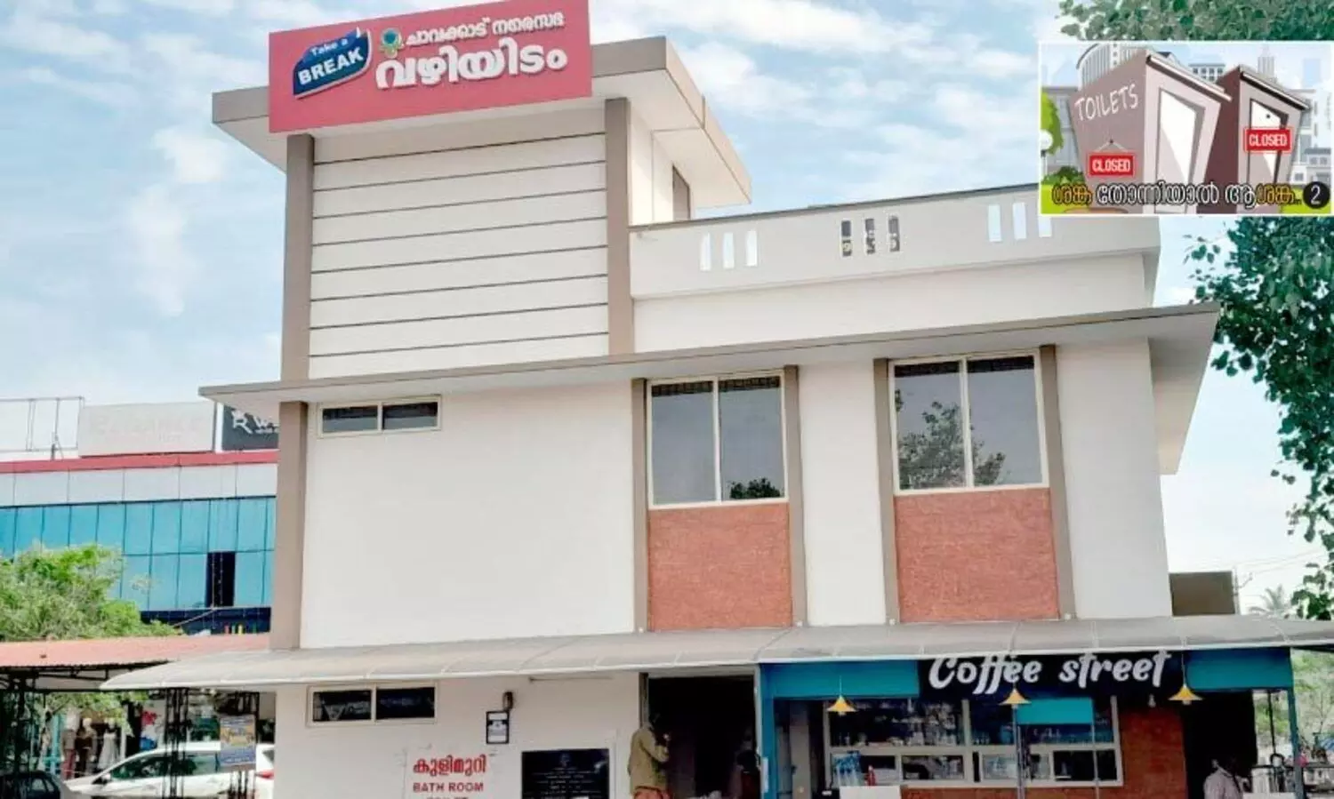 ടേക്ക് എ ബ്രേക്ക് പദ്ധതിയിൽ ചാവക്കാട് നഗരസഭ ബസ് സ്റ്റാൻഡ് പരിസരത്തെ കൂട്ടുങ്ങൽ ചത്വരത്തിൽ നിർമിച്ച വഴിയിടം. താഴത്തെ നിലയിൽ ശൗചാലയവും കോഫി ഷോപ്പും