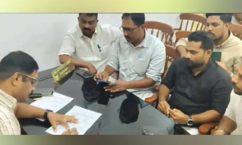 വടക്കാഞ്ചേരി ബ്ലോക്ക് പഞ്ചായത്ത് ഓഫിസിലെത്തി ബ്ലോക്ക് പഞ്ചായത്ത് സെക്രട്ടറി കെ.എ. അൻസാർ അഹമ്മദ് മുമ്പാകെ രാജി സമർപ്പിക്കുന്ന ജാഫർ