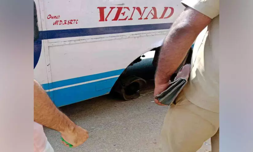 കെ.എസ്.ആർ.ടി.സി ബസിന്റെ ടയർ ഊരിത്തെറിച്ച നിലയിൽ