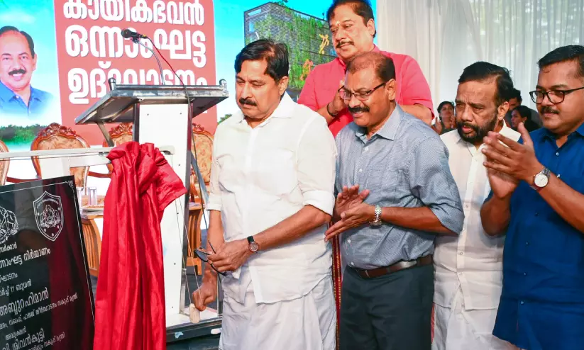 കായികഭവൻ ഒന്നാംഘട്ട ഉദ്ഘാടനത്തിയ മന്ത്രി വി. അബ്ദുറഹിമാൻ ശിലാഫലകം അനാച്ഛാദനം ചെയ്യുന്നു