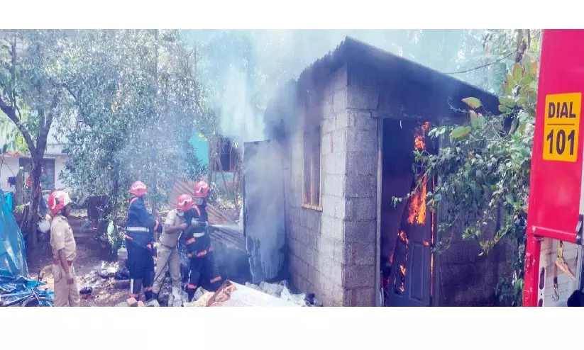 പുന്നാംകരിക്കകകത്ത് വീട്ടിൽ പടർന്ന തീ അഗ്നിരക്ഷസേന കെടുത്തുന്നു