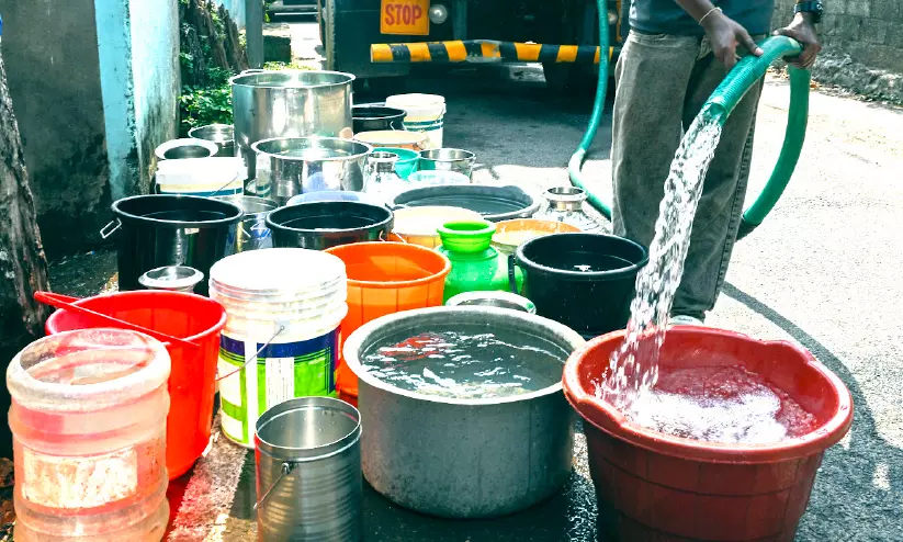 ടാങ്കറുകളിൽ എത്തിച്ച കുടിവെള്ളം വിതരണംചെയ്യുന്നു