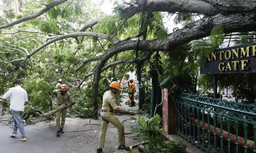 സെക്രട്ടേറിയറ്റ് കന്റോൺമെന്റ് ഗേറ്റിന് മുന്നിൽ ഒടിഞ്ഞുവീണ മരം അഗ്നിശമന സേനാംഗങ്ങൾ മുറിച്ചുമാറ്റുന്നു