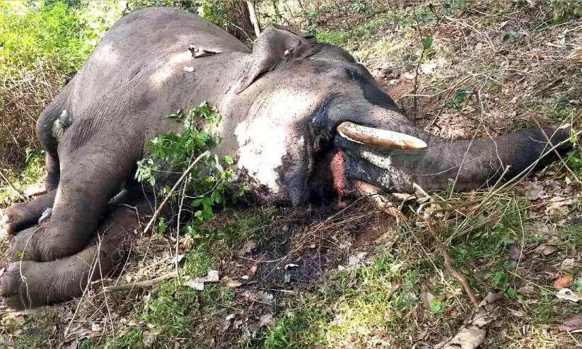 തുറപ്പള്ളി ഫോറസ്റ്റ് റോഡിൽ ചെരിഞ്ഞ കൊമ്പന്റെ ജഡം.