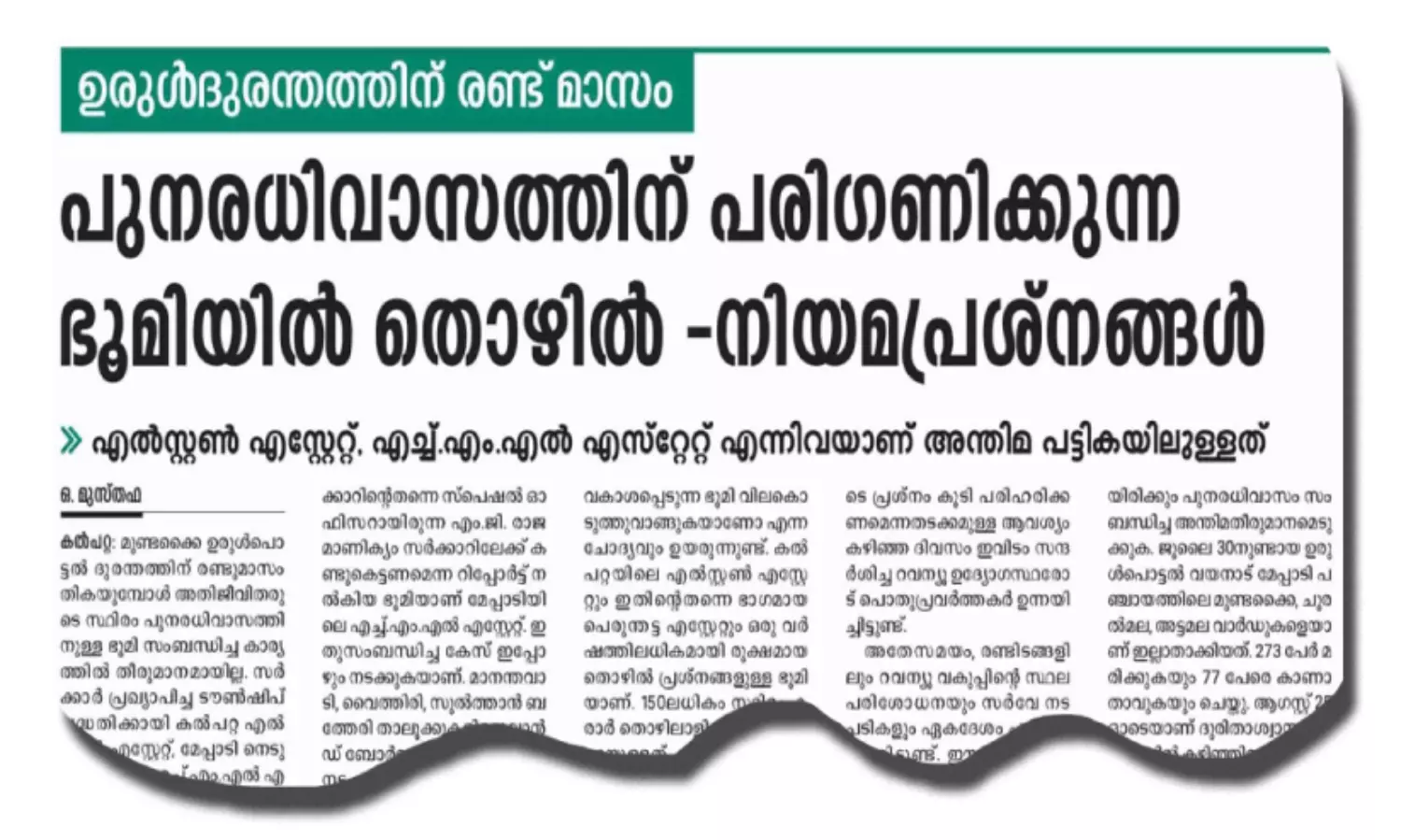 അതേസമയം, പുനരധിവാസത്തിനുള്ള മറ്റൊരു ഭൂമിയായ മേപ്പാടി നെടുമ്പാലയിലെ എച്ച്.എം.എൽ ഭൂമി സംബന്ധിച്ച് നിയമപ്രശ്നങ്ങൾ നിലനിൽക്കുന്നുണ്ട്. ജനവാസമുള്ള ഇവിടത്തെ 6.61 ഹെക്ടർ ഭൂമി ഒഴിവാക്കിയുള്ള 65.41 ഹെക്ടറാണ് സർക്കാർ ഏറ്റെടുക്കുക.