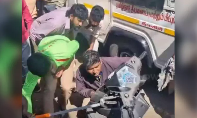 സ്കൂട്ടറിൽ കയറി കൂടിയ പാമ്പിനെ സ്പ്രേ അടിച്ച് പുറത്തേക്ക് ചാടിക്കുന്ന അഗ്നിരക്ഷാ സേന