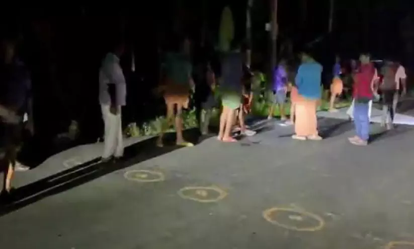 ബുധനാഴ്ച രാത്രി കടുവ നടന്നുപോയ റോഡിലെ കാൽപാടുകൾ അടയാളപ്പെടുത്തിയ നിലയിൽ