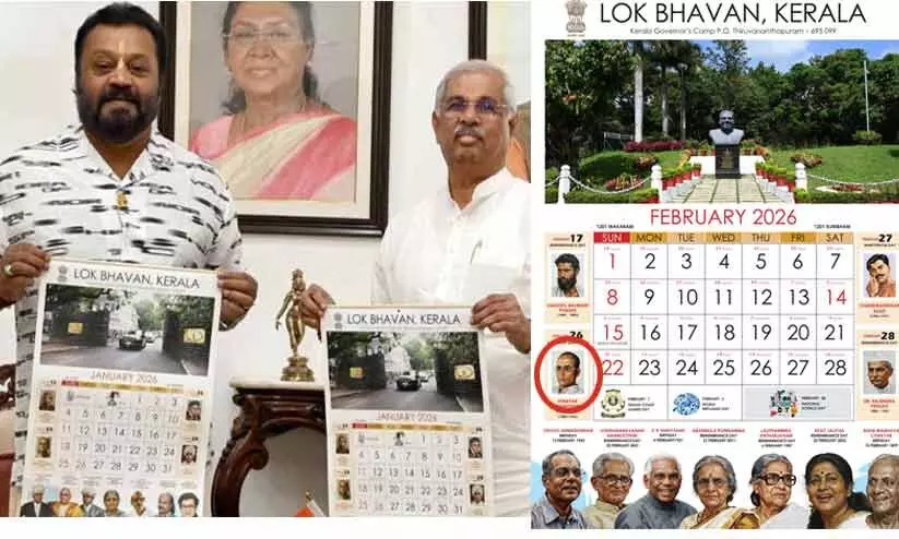 1 ലോക് ഭവൻ കലണ്ടുമായി കേന്ദ്ര മന്ത്രി സുരേഷ് ഗോപിയും ഗവർണറും. 2 സവർക്കർ ചിത്രത്തോടെയുള്ള കലണ്ടർ