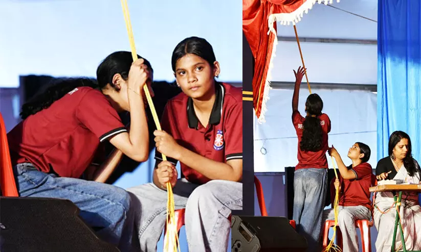 കർട്ടൺ വലിക്കുന്ന വിദ്യാർഥികൾ