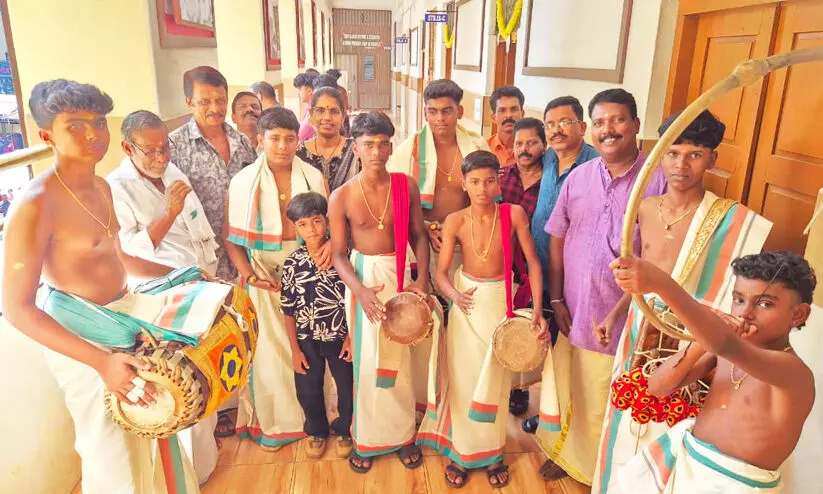 പെരിങ്ങോട് എച്ച്.എസ് സ്കൂളിലെ എച്ച്.എസ് പഞ്ചവാദ്യം കുട്ടികൾ പരിശീലകർക്കും പ്രധാനധ്യാപിക ശ്രീകലക്കുമൊപ്പം