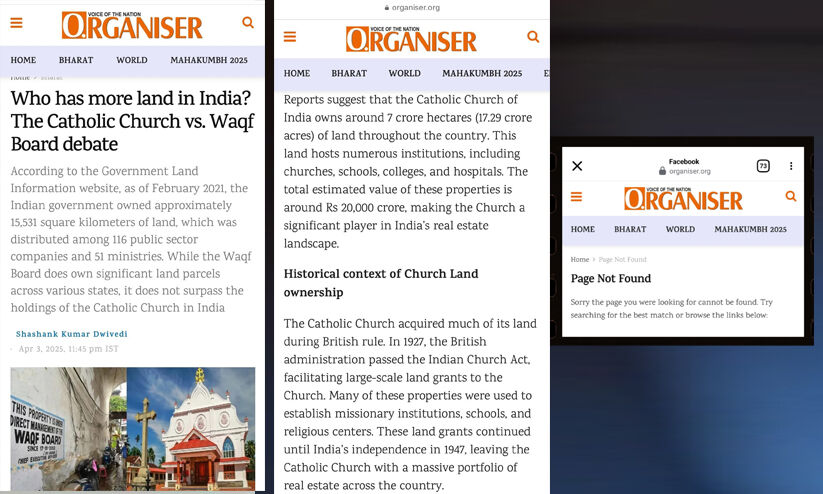 സർക്കാർ കഴിഞ്ഞാൽ രാജ്യത്തെ ഏറ്റവും വലിയ രണ്ടാമത്തെ ഭൂവുടമ കത്തോലിക്ക സഭയാണെന്നും ഇതിൽ ഭൂരഭാഗവും ബ്രിട്ടീഷ് ഭരണകാലത്ത് ലഭിച്ചതാണെന്നും ചൂണ്ടിക്കാട്ടിയാണ് ആർ.എസ്.എസ് വാരികയായ ഓർഗനൈസർ ലേഖനം പ്രസിദ്ധീകരിച്ചത്. വഖഫ് ഭേദഗതി ബിൽ പാർലമെന്റ് പാസാക്കിയതിന് പിന്നാലെയാണ് കത്തോലിക്ക സഭയുടെ സ്വത്ത് വിവരങ്ങളും സ്ഥാപനങ്ങളുടെ കണക്കുകളും വിശദമാക്കി ആർഎസ്എസ് വാരിക രംഗത്തുവന്നത്. ശശാങ്ക് കുമാർ ദ്വിവേദി എഴുതിയ ലേഖനം ചർച്ചയായതോടെ ഓർഗനൈസർ ലേഖനം പിൻവലിക്കുകയും ചെയ്തു.