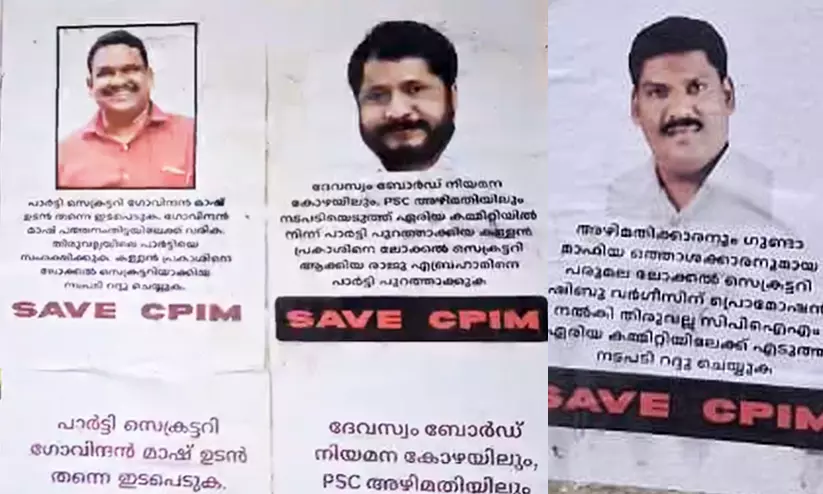 'ദേവസ്വം ബോർഡ് നിയമന കോഴയിലും പി.എസ്.സി അഴിമതിയിലും നടപടിയെടുത്ത് ഏരിയ കമ്മിറ്റി പുറത്താക്കിയ കള്ളൻ പ്രകാശിനെ ലോക്കൽ സെക്രട്ടറിയാക്കിയ രാജു എബ്രഹാമിനെ പുറത്താക്കുക. അർബർ ബാങ്ക് കൊള്ളക്കാരൻ സനൽ കുമാറിന്റെ ശിഷ്യനും ദേവസ്വം ബോർഡ് നിയമന കോഴ നടത്തി ലക്ഷങ്ങൾ തട്ടിയ കള്ളൻ പ്രകാശിനെ ലോക്കൽ സെക്രട്ടറിയാക്കിയ നടപടി റദ്ദാക്കുക' എന്നിങ്ങനെയാണ് പോസ്റ്ററിലുള്ളത്.