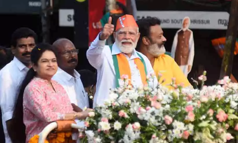 തൃശൂർ സ്വരാജ് റൗണ്ടിൽ നടത്തിയ റോഡ് ഷോയിൽ പ്രധാനമന്ത്രി നരേന്ദ്ര മോദി പ്രവർത്തകരെ അഭിവാദ്യം ചെയ്യുന്നു. സ്ഥാനാർഥികളായ പത്മജ വേണുഗോപാൽ, കെ.കെ. അനീഷ് കുമാർ, സി.സി. മുകുന്ദൻ, കേന്ദ്രമന്ത്രി സുരേഷ് ഗോപി എന്നിവർ സമീപം - ടി.എച്ച്. ജദീർ