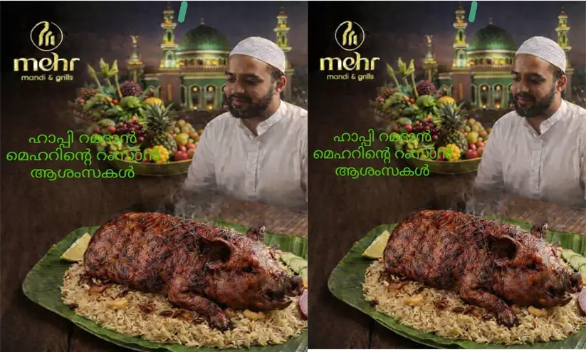 വിഷുവിനോടനുബന്ധിച്ച് മെഹർ മന്തി ആൻഡ് ഗ്രിൽസ് എന്ന റസ്റ്റാറന്റ് പുറത്തിറക്കിയ പരസ്യ പോസ്റ്റർ വലിയ വിവാദത്തിന് ഇടയാക്കിയിരുന്നു. ശ്രീകൃഷ്ണൻ മന്തി കഴിക്കുന്ന രീതിയിലായിരുന്നു പോസ്റ്റർ. വിഷു ആശംസകൾ നേർന്നുകൊണ്ടുള്ള ഈ ചിത്രത്തിൽ കൃഷ്ണന്റെ മുന്നിൽ മന്തിയും ചിക്കനും വെച്ചതാണ് വിശ്വാസികളുടെ വികാരം വ്രണപ്പെടുത്തിയെന്ന ആരോപണത്തിന് ഇടയാക്കിയത്. മനഃപൂർവം വർഗീയ ലഹളയുണ്ടാക്കാൻ ശ്രമിച്ചു എന്നാരോപിച്ച് റസ്ന്റസ്ലേറ്ക്ക്റ പ്രതിഷേധ മാർച്ചുകൾ നടന്നു. സംഭവത്തിൽ ഉടമകളായ അർഷാദ് (36), ഷംനാസ് (30) എന്നിവരെ ചേർത്തല പൊലീസ് കസ്റ്റഡിയിലെടുത്തിരുന്നു. നിലവിൽ ഇവർക്ക് ജാമ്യം അനുവദിച്ചിട്ടുണ്ട്. വിവാദം കനത്തതോടെ ഉടമകൾ സോഷ്യൽ മീഡിയയിലൂടെ മാപ്പ് പറയുകയും വിശദീകരണം നൽകുകയും ചെയ്തു. ഒരു പരസ്യ ഏജൻസിയാണ് ഈ പോസ്റ്റർ ഡിസൈൻ ചെയ്തതെന്നും അതിലെ അപാകത ശ്രദ്ധയിൽപ്പെട്ടപ്പോൾ തന്നെ അത് പിൻവലിച്ചിരുന്നുവെന്നും അവർ പറഞ്ഞു.