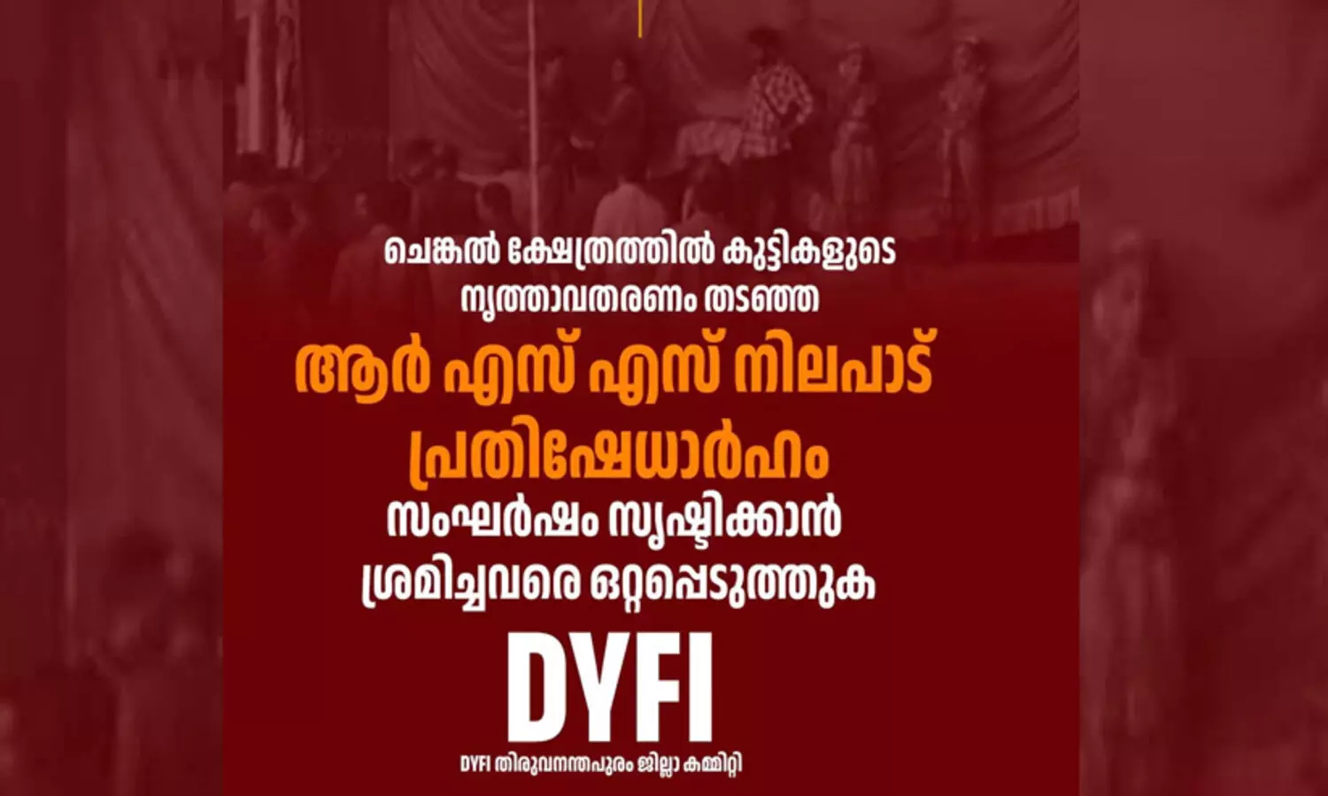 നൃത്തത്തിൽ പങ്കെടുത്ത കുട്ടികളിൽ രണ്ട് പേരുടെ രക്ഷിതാക്കളോട് നിർബന്ധിത സംഭാവന ആവശ്യപ്പെടുകയും അത് നൽകാത്തതിലുള്ള വൈരാഗ്യം കൊണ്ടാണ് ആർ.എസ്.എസ് സംഘം കുട്ടികളുടെ നൃത്താവരണം തടഞ്ഞത്. ക്ഷേത്ര വേദിയിൽ സംഘർഷത്തിന് മുതിർന്നത് അപലപനീയമാണ്. ആരാധനാലയങ്ങളുടെ സമാധാനാന്തരീക്ഷം തകർക്കുന്ന ആർ.എസ്.എസ് നടപടികൾക്കെതിരെയാണ് നീതിപീഠങ്ങൾ ശക്തമായ നിലപാട് സ്വീകരിക്കേണ്ടതെന്നും ഡി.വൈ.എഫ്.ഐ ജില്ലാ ഭാരവാഹികൾ പറഞ്ഞു.