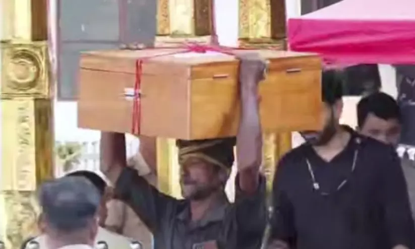 ശബരിമലയിൽ സ്വർണപാളികളിൽനിന്ന് ശേഖരിച്ച സാമ്പിൾ നിറച്ച പെട്ടിയുമായി മലയിറങ്ങുന്നു