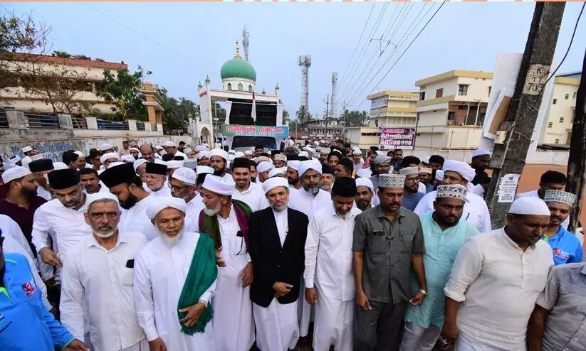 സമസ്ത ശതാബ്ദി മഹാസമ്മേളനത്തിന്റെ പതാകവാഹക യാത്ര മുഹമ്മദ് കോയ തങ്ങള് ജമലുല്ലൈലിയുടെ നേതൃത്വത്തില് കാസര്കോട് തളങ്കര മാലിക് ദീനാര് മസ്ജിദില് എത്തിയപ്പോള്
