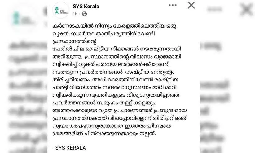 കർണാടകയിൽ നിന്നും കേരളത്തിലെത്തിയ ഒരു വ്യക്തി സ്വാർത്ഥ താൽപര്യത്തിന് വേണ്ടി പ്രസ്ഥാനത്തിൻറെ പേരിൽ ചില രാഷ്ട്രീയ നീക്കങ്ങൾ നടത്തുന്നതായി അറിയുന്നു. പ്രസ്ഥാനത്തിൻ്റെ വിലാസം വ്യാജമായി സ്വീകരിച്ച് വ്യക്തിപരമായ ലാഭങ്ങൾക്ക് വേണ്ടി നടത്തുന്ന പ്രവർത്തനങ്ങൾ രാഷ്ട്രീയ നേതൃത്വം തിരിച്ചറിയണം. അധികാരത്തിന് വേണ്ടി രാഷ്ട്രീയ പാർട്ടി വിധേയത്തം സന്ദർഭാനുസരണം മാറി മാറി സ്വീകരിക്കുന്ന വ്യക്തികളുടെ വിശ്വാസ്യതയില്ലാത്ത പ്രവർത്തനങ്ങൾ സമൂഹം തള്ളിക്കളയും. അത്തരക്കാരുടെ വ്യാജ പ്രചാരണങ്ങൾ പ്രബുദ്ധമായ പ്രസ്ഥാനത്തിനകത്ത് വിലപ്പോവില്ലെന്ന് തിരിച്ചറിഞ്ഞ് സ്വയം അപഹാസ്യരാകാതെ ഇത്തരം ഹീനമായ ശ്രമങ്ങളിൽ പിൻവാങ്ങുന്നതാവും നല്ലത്.