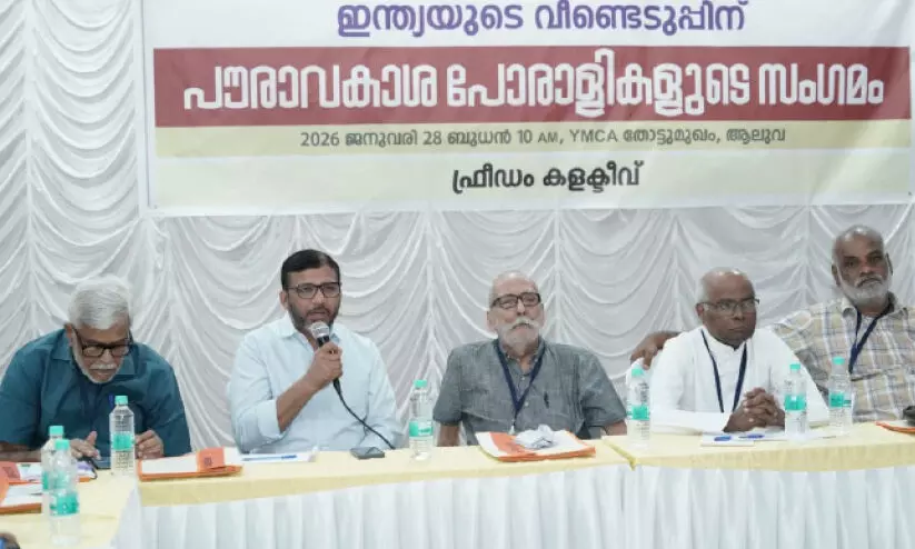 ആലുവ: കേന്ദ്ര സർക്കാർ തുടരുന്ന ഫാഷിസ്റ്റ് അധികാര ക്രമത്തെ ചെറുക്കാൻ രാഷ്ട്രീയ വ്യത്യാസങ്ങൾ മാറ്റിവെച്ചുള്ള ഐക്യനിര കെട്ടിപ്പടുക്കണമെന്ന് ആലുവ വൈ.എം.സി.എ ഹാളിൽ സംഘടിപ്പിച്ച പൗരാവകാശ സംഗമം ആവശ്യപ്പെട്ടു. ‘ഇന്ത്യയുടെ വീണ്ടെടുപ്പിന്’ എന്ന തലക്കെട്ടിൽ ഫ്രീഡം കലക്ടീവ് സംഘടിപ്പിച്ച പരിപാടിയിൽ ജനപക്ഷ രാഷ്ട്രീയത്തിന്റെയും ജനകീയ സമരങ്ങളുടെയും ഭാഗമായ നിരവധി മനുഷ്യാവകാശ പോരാട്ട സംഘടന നേതാക്കൾ പങ്കെടുത്തു.