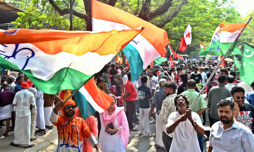 കൊച്ചി കോർപറേഷൻ വോട്ടെണ്ണൽ കേന്ദ്രമായ മഹാരാജാസ് കോളജിന് മുന്നിലെ വിജയാഹ്ലാദം (photo: ബൈജു കൊടുവള്ളി)