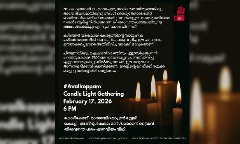 2017 ഫെബ്രുവരി 17 ഏറ്റവും ഇരുണ്ട ദിവസമായിരുനെങ്കിലും, അതേ ദിവസമായിരുന്നു അവള് സധൈര്യം അനീതിക്കെതിരെ പ്രതികരിച്ചത്. അവളുടെ പോരാട്ടത്തിനായി നമ്മള് ഒരുമിച്ച് നില്ക്കുമെന്ന തീരുമാനത്തോടെയായിരുന്നു 'അവള്ക്കൊപ്പം' എന്ന പ്രസ്ഥാനം പിറന്നത്. കഴിഞ്ഞ ഒമ്പത് വര്ഷമായി കേരളത്തിന്റെ സാമൂഹിക പരിവര്ത്തനത്തില് ഒരു ചെറിയ പങ്കു വഹിച്ച ഈ പ്രസ്ഥാനം ഇരയാക്കപ്പെട്ടവരെ അതിജീവിതകളാക്കാന് നിരന്തരം പ്രവര്ത്തിച്ചു. പിന്തുണക്കും ഐക്യദാര്ഢ്യത്തിനും എല്ലാവര്ക്കും നന്ദി പറഞ്ഞുകൊണ്ട്, ഡബ്ല്യുസിസി അവള്ക്കൊപ്പവും, അതിജീവിച്ച എല്ലാവര്ക്കും ഒപ്പം നില്ക്കുന്നവരെയും ഈ യാത്രയുടെ ഭാഗമാവാന് ക്ഷണിക്കുന്നു. ഇരുട്ടിന്റെ മറ നീക്കി നമുക്ക് വെളിച്ചത്തിന്റെ തിരി തെളിക്കാം' -ഇതാണ് ഡബ്ലിയു.സി.സിയുടെ പോസ്റ്റ്.
