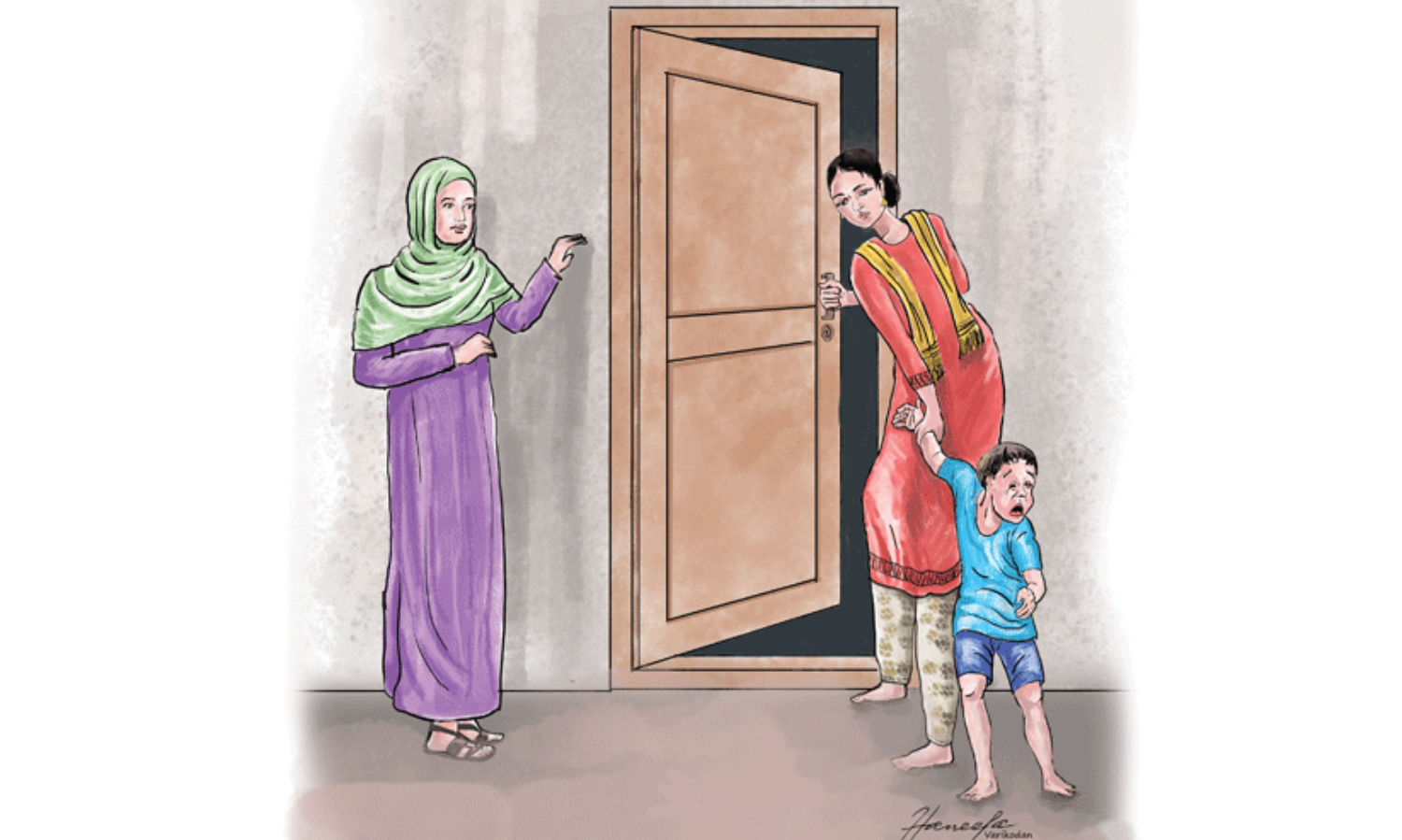 ഒരു ദിവസം രാവിലെ ഏകദേശം 10 മണിയോടടുത്ത സമയം. കുഞ്ഞിന്റെ നിലവിളി, അതോടൊപ്പം വാതിൽ വലിച്ചടക്കുന്ന ശബ്ദവും. എന്താണെന്നറിയാൻ ഞാൻ ഓടിപ്പോയി എന്റെ വീടിന്റെ വാതിൽ തുറന്നുനോക്കിയപ്പോൾ പുറത്ത് ആരെയും കാണാനില്ല. അകത്തുനിന്ന് കുഞ്ഞിന്റെ കരച്ചിൽ മാത്രം. എനിക്കൊന്നും മനസ്സിലായില്ല.