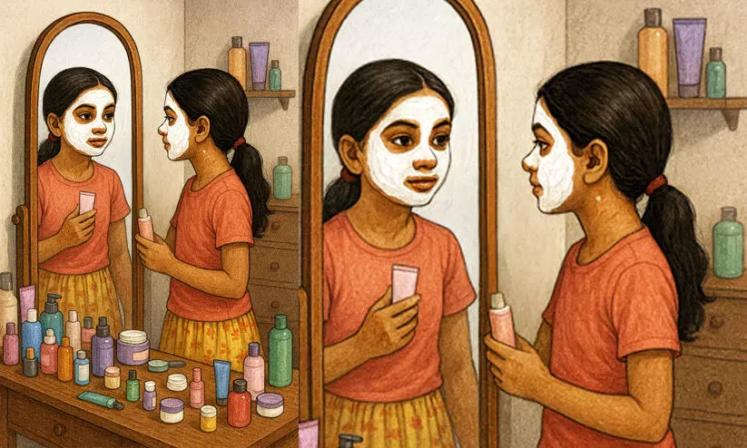 ദോഷകരമല്ലാത്തത് എന്ന് പലരും കരുതുന്ന ഫേസ് മാസ്ക്, സൺ സ്ക്രീൻ, ലിപ് ബാം പോലുള്ളവയിൽ തുടങ്ങുകയും പിന്നെ ‘സിറം’, ഗ്ലോയിങ് ക്രീം എന്നിവയിലേക്ക് പുരോഗമിക്കുകയും ചെയ്യുന്ന കുഞ്ഞു പിള്ളേരുടെ എണ്ണം ചെറുതല്ല. ഇൻസ്റ്റഗ്രാം അടക്കമുള്ള സോഷ്യൽ മീഡിയ ട്യൂട്ടോറിയലുകളും മുതിർന്ന ഇൻഫ്ലുവൻസർമാരുടെ ജീവിതശൈലിയുമാണ് പല കുട്ടികളുടെയും പ്രചോദനമെന്ന് ഒന്നു ശ്രദ്ധിച്ചാൽ മനസ്സിലാകും. കുട്ടികൾ സ്ഥിരമായി ഫോളോ ചെയ്യുന്ന സമപ്രായക്കാരോ കൗമാര പ്രായക്കാരോ അതും കടന്ന് മുതിർന്നവരോ ആയ വ്ലോഗർമാരെയാണ് അവരാദ്യം അനുകരിക്കുക. പിന്നീട് പലതരം ഓൺലൈൻ ബ്യൂട്ടി ട്യൂട്ടോറിയലുകളിലേക്കും അവർ സ്ക്രോൾ ചെയ്യും.