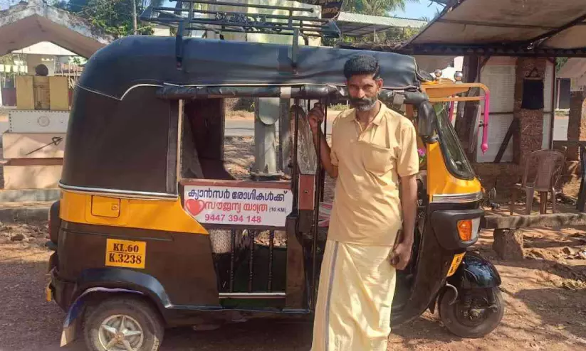 ചെറുവത്തൂർ: മനുഷ്യസ്നേഹത്തിന്റെ നല്ലപാഠം പകർന്ന് അർബുദത്തെ തോൽപിക്കുകയാണ് ഓട്ടോ ഡ്രൈവർ യു. ഭാസ്കരൻ (61). അർബുദരോഗികൾക്ക് തന്റെ ഓട്ടോയിൽ സൗജന്യ യാത്ര ഒരുക്കിക്കൊണ്ടാണ് ചീമേനി നിടുംബയിലെ ഭാസ്കരൻ ഗ്രാമത്തിൽ നന്മയുടെ പ്രകാശം പരത്തുന്നത്. അർബുദരോഗികൾക്ക് 10 കിലോമീറ്റർ സൗജന്യമായി ഭാസ്കരന്റെ ഓട്ടോയിൽ യാത്ര ചെയ്യാം.
