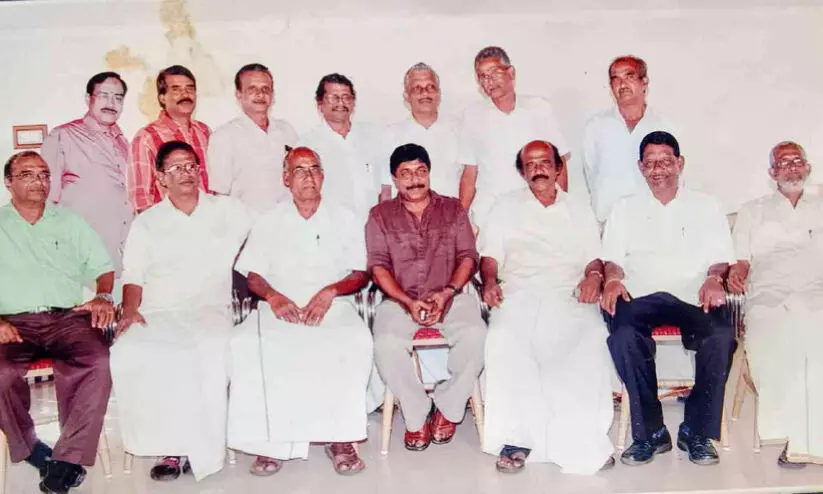 ശ്രീനിവാസൻ പങ്കെടുത്ത മട്ടന്നൂർ പഴശ്ശിരാജ എൻ.എസ്. കോളജ് പൂർവ വിദ്യാർഥി സംഗമത്തിന്റെ ഫോട്ടോ. ശ്രീനിവാസന്റെ ഇടത്ത് അബ്ദുൽ കരീം, വലത്ത് സുകുമാരൻ