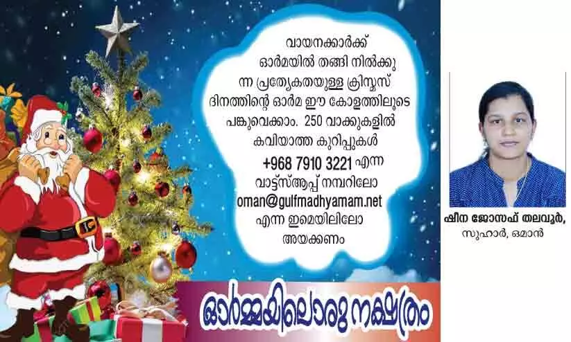 ഹൃദയത്തിൽ നിറഞ്ഞ സന്തോഷത്തിന്റെ മധുരം. അതുപോലെ അയൽപക്ക വീടുകളിൽ കേക്ക് സമ്മാനിക്കുന്നത് വളരെ സന്തോഷം നിറഞ്ഞ ഒരു അനുഭവം ആയിരുന്നു. ഡിസംബർ മാസം തുടങ്ങുന്നതോടെ വീട്ടിൽ ഒരു വ്യത്യസ്തമായ ഒരു ആവേശം നിറയുമായിരുന്നു. ക്രിസ്മസ് വൈകുന്നേരങ്ങളിൽതന്നെ വീടിന്റെ മുന്നിലെ ചെറിയ നക്ഷത്രം തെളിയിക്കും. അത് അത്ര പ്രകാശമുള്ളതല്ലെങ്കിലും ഞങ്ങളുടെ ബാല്യഹൃദയങ്ങൾക്ക് അത് ഏറ്റവും മനോഹരമായ വെളിച്ചമായിരുന്നു.